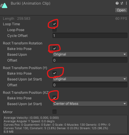 アニメーションクリップの以下のチェックが入っていない場合が多いです。