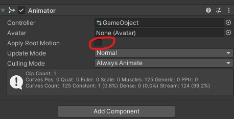 Animator の「Apply Root Motion」をOFFにすると直る、